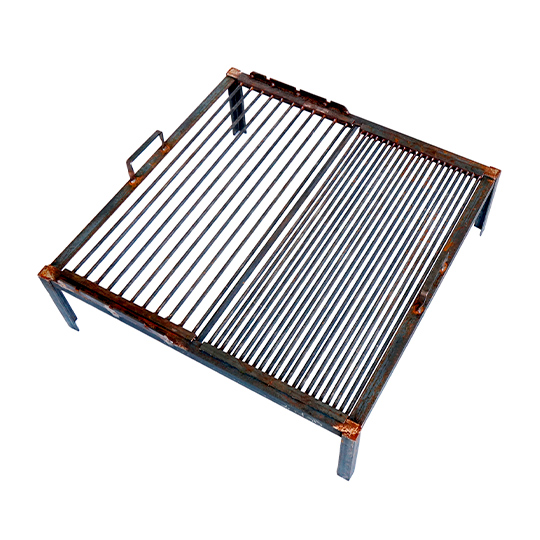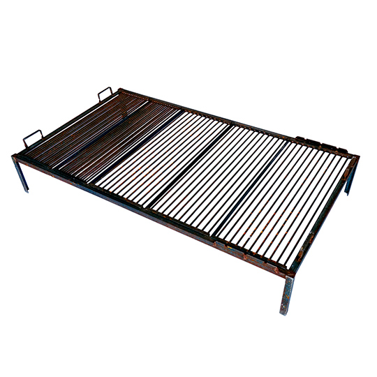 El marco de la parrilla y los cuatro apoyos están conformados con perfil ángulo 1×1/8, los módulos desmontables son de hierro redondo del 7(40 x 64 cm) u 8 (70 x 80)