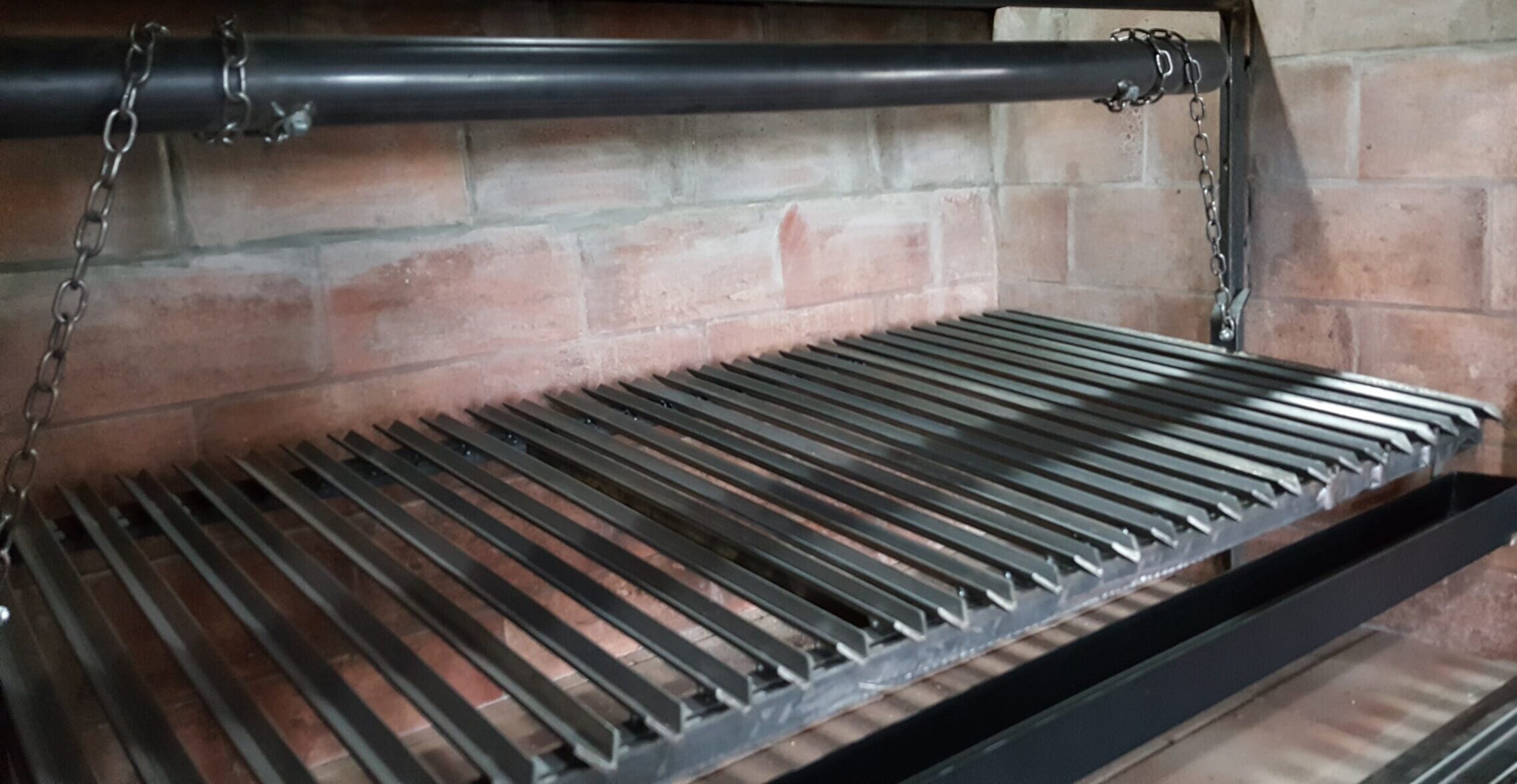 Parrilla fabricada con un marco de perfil ángulo 1×1/8 y planchuela 1 x ¼, en módulos desmontables de perfil ángulo 5/8×1/8 y una grasera de chapa pintada desmontable.